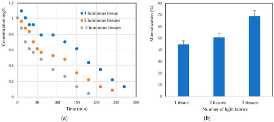 An in-depth study was carried out to evaluate RB5 degradation efficiency as a function of the number of luminous tissues. The final degradation efficiencies and mineralization yields obtained are shown in Figure 8a,b. It is interesting to note that the increase in the number of luminous textiles in the same volume of reactor leads to the increasing of compacity. The results obtained confirm that the degradation efficiency and mineralization were high with three light fabrics, and this trend can be confirmed in Figure 8b, where the rate of mineralization increased by 30% from one light fabric to three. This efficiency could be explained by the large catalytic surface area exposed to light when using three fabrics. Recently, work on flumequine found the same trends [20]. In fact, the increase in the amount of TiO2 loading has enhanced the mineralization of antibiotics.