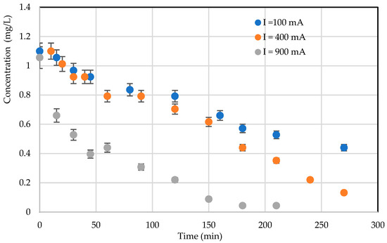 Light intensity is an elementary factor in photocatalytic degradation, as electron-hole pairs are produced by UV light energy. Figure 9 shows the plot of degradation efficiencies with three different intensities. Different light intensities were obtained by varying the electrical intensity of the LEDs. Figure 9 shows that RB5 degradation kinetics are faster with increasing light intensity for an initial concentration of 1 mg/L. This is explained by the fact that by increasing the light intensity, more energy reaches the TiO2 surface for better electron–hole pair production, and, hence, better degradation efficiencies have been obtained. It is therefore clear that the kinetic constant k increases with the light intensity.