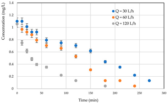 Mass transfer limitation is a key factor when studying a continuous photocatalytic process. This limitation to mass transfer can lead to a low degradation rate [35]. From a hydrodynamic point of view, a reaction involving a solid catalyst can be limited by external mass transfer. Figure 10 presents the effect of recirculation flow rate on photocatalytic degradation kinetics; it would appear that degradation kinetics are more efficient at high flow rates. It can be seen that increasing the flow rate intensifies the mass transfer step with the creation of turbulence next to the light fabric (the site of the chemical reaction). This suggests that, although the reactor is compact, the problems of transfer limitation have not yet been completely resolved [33,34,35].