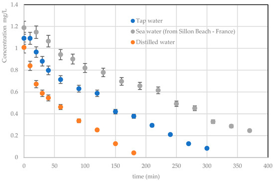 To understand the feasibility of textile effluent treatment under realistic conditions, a comparison was made between effluent prepared from tap water, from EUP and from seawater (recovered from the Sillon beach—Sait Malo 35, France: temperature = 20 °C, pH~8 and salinity of ~30%). Experiments were performed with RB5 at a concentration of 1 mg/L and a volume flow rate of 60 L/h.
