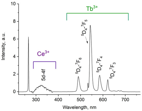 Room temperature luminescence spectra of Ce0.5Y0.35Tb0.15F3 nanoparticles as 7.9 g/L water colloidal solution. λex = 266 nm corresponds to 4f–5d absorption band of Ce3+.