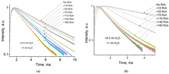 It can be seen that an increase in the concentration of Rch molecules in the colloid leads to the shortening of the luminescence decay times of Tb3+ ions, which is apparently a consequence of efficient nonradiative energy transfer from nanoparticles to Rch. This tendency is observed for both types of samples (Figure 4a,b). We have diluted colloids with high concentrations of Rch with distilled water to check the stability of the nanoparticle–Rch complexes. In the case of unmodified nanoparticles, the luminescence decay rate got back to the larger values. It means that this complex is not stable, and the photosensitizer molecules are capable of separating from the nanoparticle surface. In the case of nanoparticle–PVP–Rch composites, the decay curves stayed constant after the addition of water. It apparently indicates the formation of relatively stable conjugates. For higher concentrations of Rch, the deviation from the single exponential law of the decay curves is observed. This observation can be related to the fact that different nanoparticles are conjugated with different amounts of Rch molecules. In this case, the rate of Tb3+ luminescence quenching depends on the amount of conjugated Rch molecules; in turn, it leads to the multiexponential character of the decay curve. The luminescence lifetime was calculated as an average lifetime according to Formula (1) [42]: