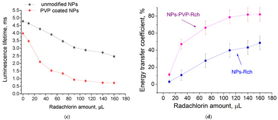 where —is the luminescence intensity. The results of the lifetime evaluation are presented in Figure 4c. The values of the luminescence lifetime of the Tb3+ ions at 541 nm obtained here for the colloidal solution of unmodified nanoparticles without Rch appear to be larger than those obtained by us for dry samples in our previous work [23]. It can be explained by the radiative energy transfer between nanoparticles in colloids. The efficiency of energy transfer () can be calculated from luminescence decay time values according to Formula (2) [43]:
