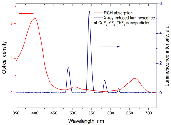 Radachlorin absorption spectrum and X-ray luminescence spectrum of Ce0.5Y0.35Tb0.15F3 nanoparticles. The arrows indicate corresponding Y-axis.
