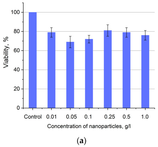 The colorimetric MTT assay was used to investigate the cytotoxicity of the samples with the test protocol adopted from work [33]. The A549 cells were investigated in 96-well plates (SPL Lifesciences, Pocheon, Republic of Korea) in a concentration of 104 cells/well. After seeding and 12 h incubation, a medium in wells was replaced with the 100 µL of fresh, containing nanoparticles (ratio of 1/10 (v/v) sample suspension in water/medium for each concentration, sonicated for 10 min in a sonication bath, model ODA-LQ40, 600 W, volume 4 L). Exposure time was 24 h at 37 °C in humid air (98%) containing 5% CO2. Three hours before the end of the exposure period, the MTT (3-(4,5-dimethyl-2-thiazolyl)-2,5-diphenyltetrazolium bromide, Sigma-Aldrich, #M5655, St. Louis, MO, USA) solution in 0.1 M pH 7.2 phosphate-buffered saline (PBS) (5 mg/mL, 20 μL/well) was added to the cells. After the completion of the exposure period, the supernatant was removed, and 100 μL/well solution containing 10% SDS (Sigma-Aldrich, #L3771) in PBS was added. Absorbance at 570 nm for each well was measured using a microplate reader (Biorad, xMark, Moscow, Russia).