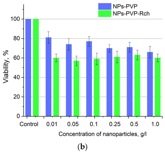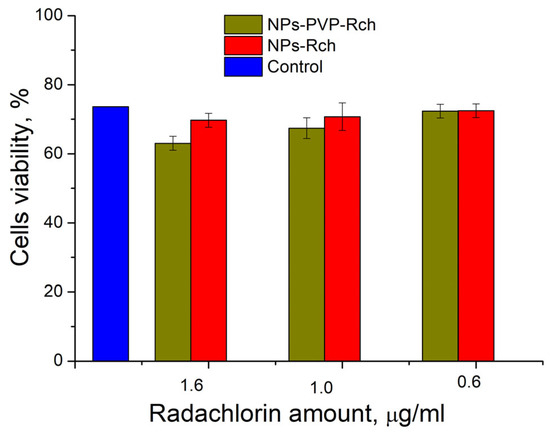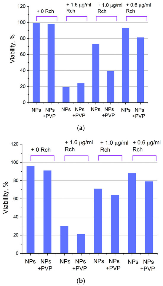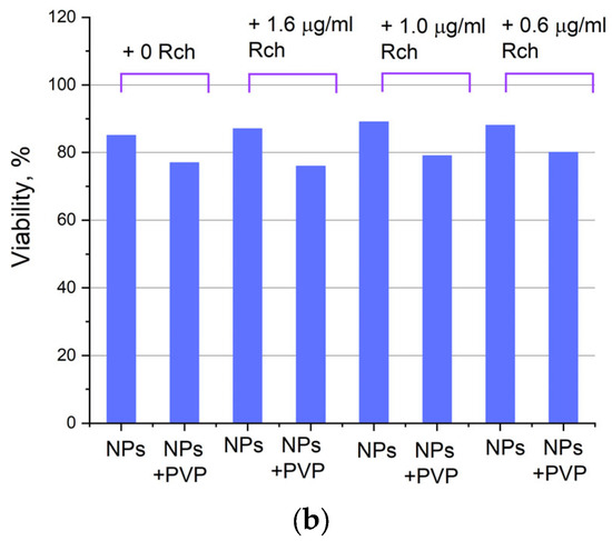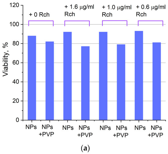 We can see that Ce0.5Y0.35Tb0.15F3-Rch composites do not work effectively. As mentioned above, unmodified nanoparticle-Rch does not demonstrate stability (Figure 4b). In turn, Ce0.5Y0.35Tb0.15F3–PVP–Rch composites provide a notable decrease in cell viability. In particular, after X-ray irradiation, the survival decreased by ~12%.
