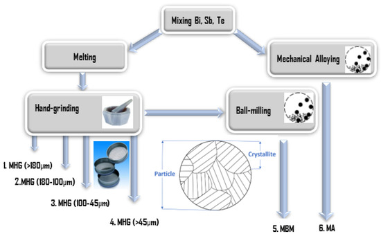 For brevity, samples prepared via melting and hand grinding will be noted as MHG, samples prepared via melting and ball-milling will be noted as MBM and samples prepared via mechanical alloying will be noted as MA. In summary, six types of powders with different particle sizes were prepared, as illustrated in Figure 1.