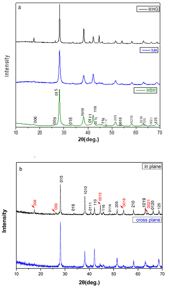 Figure 2a displays XRD patterns of the powders produced by melting (MHG), mechanical alloying (MA) and ball-milling (MBM). The Miller indices of all major peaks are indicated, and all observed diffraction peaks were indexed to the rhombohedral crystal structure corresponding to Bi0.3Sb1.7Te3 (R3m space group).