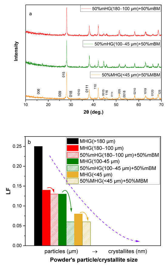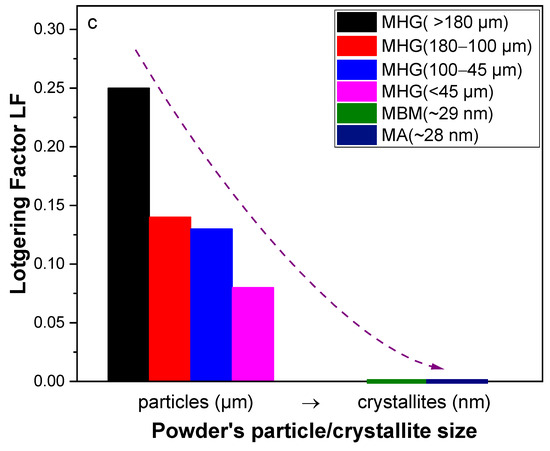 As shown in Table 1 and Figure 2c, the LF increases from zero, for MA and MBM samples, which is indicative of randomly oriented samples, to 0.25 for MHG (>180 μm) samples, which clearly indicates a rather strong microstructural anisotropy. SEM analysis of fractured MA samples, as presented in our recent publication [17], confirmed the randomly oriented nature of the microstructure in these materials, further supporting the XRD results.