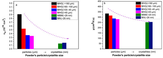 (a) Carrier concentration (nH) and (b) carrier mobility (μ) at room temperature as a function of powder particle crystallite size of the hot-pressed Bi0.3Sb1.7Te3 samples.