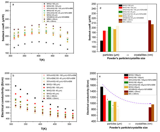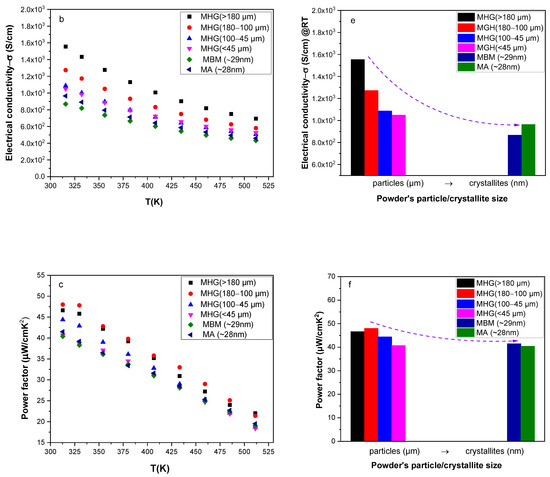 The temperature dependence of the Seebeck coefficient and electrical conductivity is illustrated in Figure 4a and Figure 4b, respectively. The Seebeck coefficient increases with increasing temperature, reaches a maximum value at around T = 400 K and then gradually decreases due to the onset of bipolar conduction (minority carriers are excited into the conduction band). The enhancement in the Seebeck coefficient for samples prepared from smaller particles is attributed to the carrier concentration reduction (as can be seen in Figure 3a). The highest Seebeck coefficient (S ~ 227 μV/K at 400 K) was achieved by MBM, while the sample with the largest powder particle size MHG (>180 μm) recorded the lowest value (S ~ 188 μV/K at 400 K). In nanostructured materials, interfacial energy barrier scattering can dominate the transport, leading to charge carrier filtering and, therefore, a higher Seebeck coefficient [25].