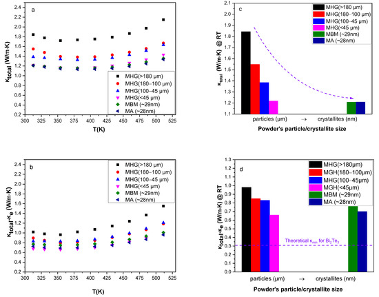 Temperature dependence of (a) total thermal conductivity (κtotal) and (b) lattice and ambipolar thermal conductivity (κtotal − κe) for the hot-pressed Bi0.3Sb1.7Te3 samples. (c) κtotal and (d) κtotal − κe at room temperature as a function of particle/crystallite size.