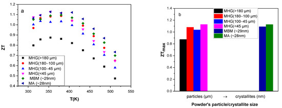 The calculated ZTs are presented in Figure 6. The results reveal that the best thermoelectric performance ZT (350 K) ~ 1.13 is obtained for two samples: the MA sample and the MHG (≤45 μm) sample. This value is almost 30% higher than that of MHG (>180 μm). In addition, the average ZT (ZTav) value of MA and MHG (≤45 μm) samples, over the investigated temperature region, is 1.02 and 0.96, respectively, while the ZTav value of MHG (>180 μm) is only 0.74. Although the calculated power factors of the MA and MHG (≤45 μm) samples were significantly lower than those of samples prepared from powders with larger particle sizes due to the lower electrical conductivities, their remarkably reduced thermal conductivity contributed to achieving a high ZT.