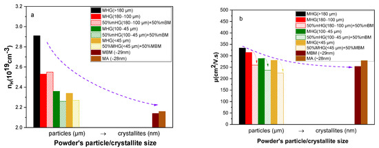Figure 8 shows the hole concentration (nH) and carrier mobility (μ) as a function of the initial powder particle size. As discussed in the first part of this work, MHG samples have notably higher carrier concentration than MBM and MA samples. In addition, nH monotically decreases with decreasing particle size. Thus, the combination of powders consisting of 50% nano-crystallites and 50% micro-particles is expected to decrease the carrier concentration compared to MHG samples. However, the difference in nH between the MHG (180–100 μm) sample and its nanocomposite counterpart MHG (180–100 μm) + 50% MBM is insignificant. On the other hand, 50% MHG (100–45 μm) + 50% MBM and 50% MHG (<45 μm) + 50% MBM present slightly lower nH than the anologous MHG materials, as expected. Materials prepared from mixing MBM and MHG powders revealed lower hole mobility. Specifically, MHG (180–100 μm), MHG (100–45 μm) and MHG (<45 μm) illustrate 18–20% higher μ in comparison to their nanocomposite counterparts. The reduction in μ is attributed to the enhanced hole scattering in materials originated from nm-crystallites, mainly resulting from the lower degree of preferred orientation, the higher density of interfaces and grain boundaries.