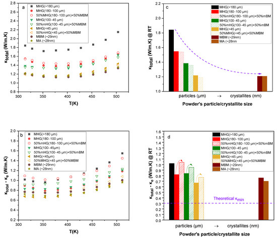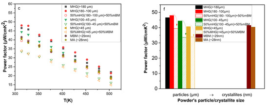 The temperature dependence of the Seebeck coefficient, electrical conductivity and power factor is illustrated in Figure 9a–c, while the Seebeck coefficient, electrical conductivity and power factor values at room temperature are presented in Figure 9d–f as a function of powder particle/crystallite size. Despite the slightly lower nH values, the S of samples prepared from powder mixtures is about the same as that of the analogous MHG materials. Samples prepared via MBM and MA still have the highest S values, while the samples prepared from the powder with the largest particle size have the lowest S. The electrical conductivity (σ) of nanocomposites is significantly lower than that of the analogous MHG samples. Specifically, σ at room temperature is reduced by 17%, 21% and 22% for 50% MHG (180–100 μm) + 50% MBM, 50% MHG (100–45 μm) + 50% MBM and 50% MHG (<45 μm) + 50% MBM, respectively, in comparison to the analogous MHG samples reaching almost similar σ values as the samples prepared exclusively from nano-powders (MBM and MA). As mentioned before, S and nH do not significantly change after mixing MHG and MBM powders, leading us to the conclusion that the electrical conductivity reduction is a result of the hole mobility alteration. The mobility of carriers is notably reduced in samples prepared from both MHG and MBM, due to the increased scattering at the grain boundaries and the lower degree of preferred orientation, which consequently results in a lower electrical conductivity. Apart from this, in the case of 50% MHG (<45 μm) + 50% MBM, its lower density (88%) than that of its MHG counterpart could also influence the σ reduction. The calculated power factors (PFs) are presented in Figure 9c,f. The PF of 50% MHG + 50% MBM samples is severely reduced in comparison to that of their 100% MHG counterparts, reaching even lower values than MBM and MA samples. The intense reduction in PF is mainly attributed to the decrease in electrical conductivity.