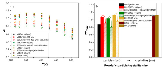The calculated ZTs are presented in Figure 11 as a function of temperature. The ZT of samples fabricated by mixing 50% MHG and 50% MBM powders is lower than their 100% MHG counterpart, mainly due to the significant decrease in electrical conductivity and power factor. Specifically, 50% MHG (180–100 μm) + 50% MBM, 50% MHG (100–45 μm) + 50% MBM and 50% MHG (<45 μm) + 50% MBM samples exhibit 17%, 22% and 15% lower ZTmax than the analogous 100% MHG samples.