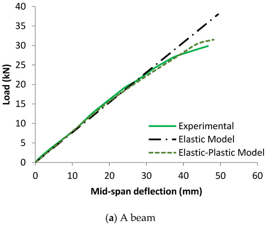 Figure 4 compares the numerical load-midspan deflection responses for the analyzed timber beams using elastic and elastic-plastic models for the experimental data. The results revealed that the load-midspan deflection behavior of bare timber beams represented by the elastic model is always completely linear and the value of the applied load is continuously rising. In contrast, the experimentally tested timber beam behaviors are initially linear, followed by a non-linear region along with a decrease in the slope of the load-deflection curves. By comparing the behavior of the timber beams represented by the elastic model with the experimental records, it was found that they are compatible only in the linear phase and completely separate when the slope of the experimental curve is changed. This is due to the absence of a definition of the maximum limits of the stresses of timber material within this model, which led to the continuity of increasing the load with deflection, as shown in Figure 4.