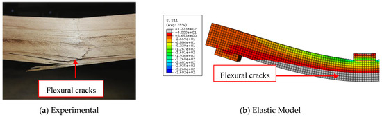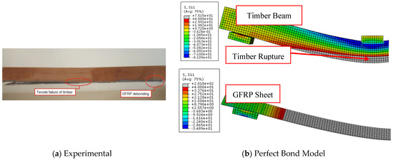The perfect bond model was able to predict the flexural cracks and the rupture that occurred in the timber beams as well as the cohesive zone model, even though it was unable to predict the pattern of the debonding of the strengthening FRP sheets from the timber beams and the value of the predicted ultimate load compared to the experimental records was exaggerated. Therefore, the perfect bond model was able to predict with high efficiency the load-deflection response and the ultimate load of the D-NA-U specimen, which collapsed as a result of the cracking of the timber beams in the compression zone, as shown in Figure 13.