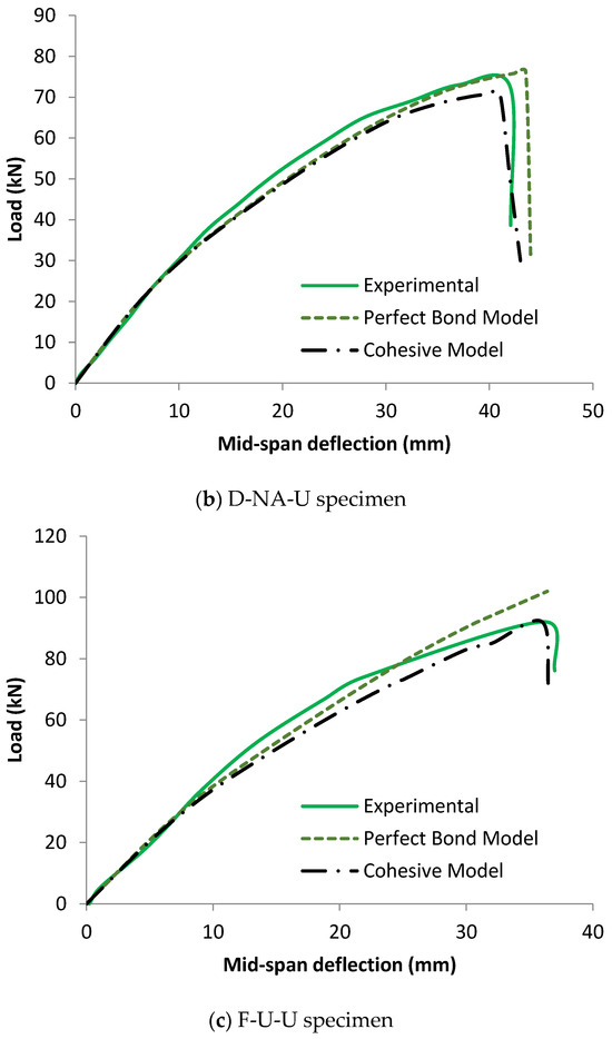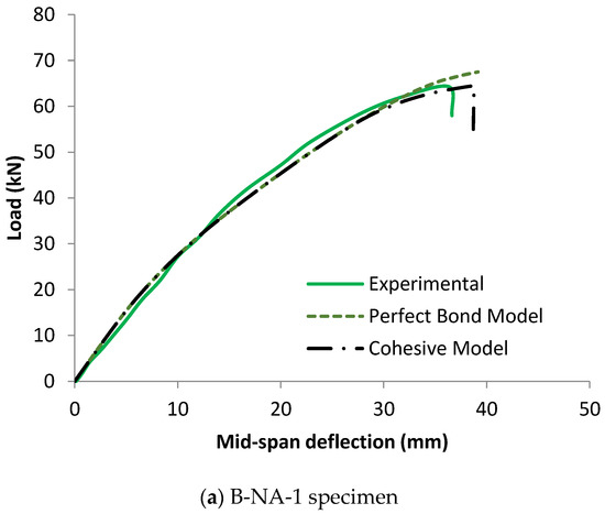 The effectiveness and accuracy of the used numerical model are substantially impacted by the pattern of collapse. The perfect bond model, in contrast to the cohesive zone model, failed to correctly estimate the ultimate loads of specimens F-U-U, B1, B2, and B-NA-1, as shown in Figure 9, Figure 10, Figure 11, and Figure 12, respectively. This is due to the fact that these FRP-enhanced timber beams collapsed as a result of FRP sheets debonding from timber substrates at the level of the adhesive layer or even with a thin layer of timber. The numerical axial stress analysis revealed that the four beams (F-U-U, B1, B2, and B-NA-1) represented by the perfect bond model ruptured because the stress level in the FRP sheets surpassed their ultimate tensile strength. Contrarily, in the case of these beams’ representation using the cohesive zone model, the interfacial shear stress value exceeded the maximum shear strength values previously defined, leading to the debonding of the strengthening sheets from the surface of the timber beams and accurately simulating the experimental results.