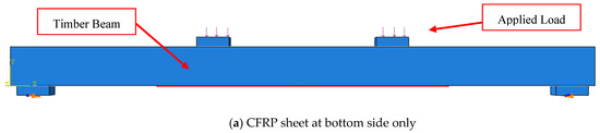The timber beams that Nadir et al. [9] experimentally tested and strengthened using CFRP sheets, which have a higher tensile strength than the GFRP sheets, were the basis for the parametric analysis. Table 7 presents the numerical program for the analyzed specimens, indicating the length, location, and thickness of the strengthening CFRP sheets, while Figure 14 shows the strengthening configurations.