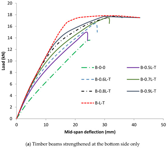- The increase in the flexural rigidity of timber beams was strengthened only in the tensile zone with increasing lengths, and their counterparts were strengthened in both the tensile and compressive zones with the same strengthening lengths, in the ranges of 49–66% and 108–165%, respectively, with respect to the control timber beam.