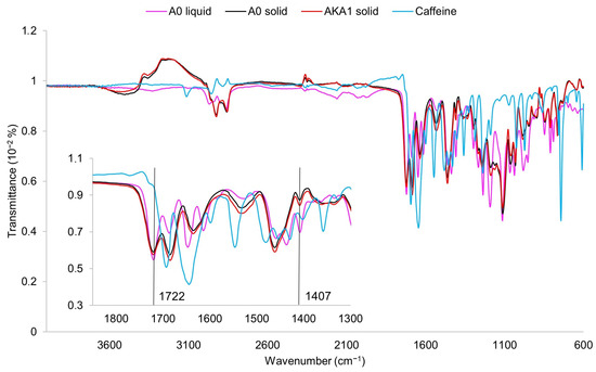 FTIR-ATR spectra for resin before crosslinking (A0 liquid), resin after crosslinking (A0 solid), resin with 100 mg caffeine and ethanol (AKA1 solid), and caffeine (caffeine).