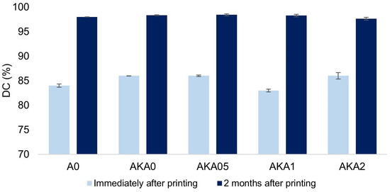 The intensity of the peaks corresponding to the C=C acrylic bonds decreases after the printing process, which is present for the A0 solid and AKA1 solid samples with respect to the A0 liquid sample, indicating the disappearance of double bonds and crosslinking of the structure. To determine the degree of double bond conversion based on the change in peak area, data for peaks with a wavenumber of 1407 cm−1 were used, since only this peak among the three corresponding to C=C bonds after the crosslinking process does not overlap with any other peak from other bonds. In addition, the reference peak for wavenumber 1722 cm−1 corresponding to the carbon-oxygen C=O double bond [25], which does not change during the crosslinking process, was used in the calculations.