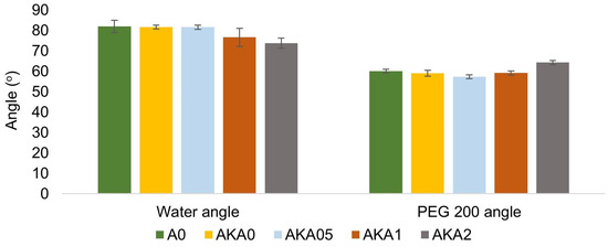 Figure 3 and Figure 4 show the results of wettability measurements using the hanging drop method. The values of the wetting angle of the drop on the surface of the samples using water slightly decrease with increasing caffeine content. For PEG 200 liquid, the amplitude between the results for samples without and with caffeine is 5°, so it can be said that the results are comparable. However, it can be seen that there is an increase in the surface energy for sample AKA2 relative to the other samples, as well as an increase in the polar component and a decrease in the dispersive component of the energy with increasing caffeine content in the samples. The described observations are caused by the predominantly hydrophilic nature of caffeine, whose presence in the composite samples improves their water wettability. In terms of drug release from the resin in contact with the human body, this is a favorable aspect that may improve caffeine migration in the presence of water from human skin.