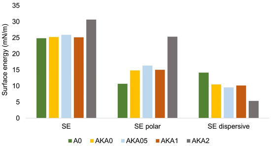 The wettability of the samples was determined through contact angle values using two substances: water and polyethylene glycol 200 (Sigma-Aldrich, Saint Louis, MO, USA) using the hanging drop method with the aid of an OCA 20 Optical Goniometer apparatus (Dataphysics, Filderstadt, Germany). The surface energy (SE) consisting of two components, polar and dispersion, was calculated using the Owens–Wendt method presented by Equation (2):