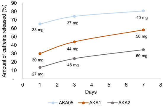 The profile of caffeine release from the samples at 1, 3 and 7 days is shown in Figure 5. The error values for the results obtained were less than or equal to 3%, so they were not presented graphically to increase the readability of the graph. After the first day, the percentage amount of released caffeine was 14, 30 and 65% for samples AKA2, AKA1 and AKA05, respectively, which was calculated by relating the values of 27, 30 and 33 mg of released caffeine to the original caffeine content of the sample. The amount of caffeine released after 1 day for each sample is similar at around 30 mg. After 3 and 7 days, it can be seen that the more caffeine there is in the sample, the more that is released. After 7 days, the amount of caffeine released increases by an average of 20 percentage points for each sample relative to the first day of release, reaching a maximum value of 81% for sample AKA05. The difficulty in achieving 100% caffeine release is probably caused by the limited solubility of caffeine in ethanol and the establishment of an equilibrium between the caffeine concentration in the sample and the concentration in ethanol. When samples are soaked, ethanol penetrates deep into the sample’s structure, allowing this equilibrium to change in favor of a higher caffeine concentration in the ethanol surrounding the sample, thus allowing more caffeine to be released from the sample through diffusion along with an increase in the time the sample is held in ethanol, which is nevertheless not enough to release all of the caffeine from the samples. To be sure of the cause of the limited caffeine release from the samples, additional studies should be conducted. This is an aspect that opens up research threads related to improving the release rate from photoresin-based composites loaded with non-crosslinking substances.