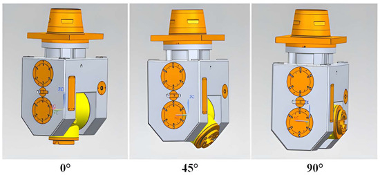 In order to study the static characteristics of the swing angle milling head under different working conditions, three typical milling head angles (i.e., 0°, 45° and 90°) are selected for comparative analysis, as shown in Figure 2.