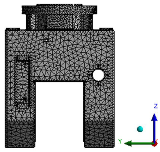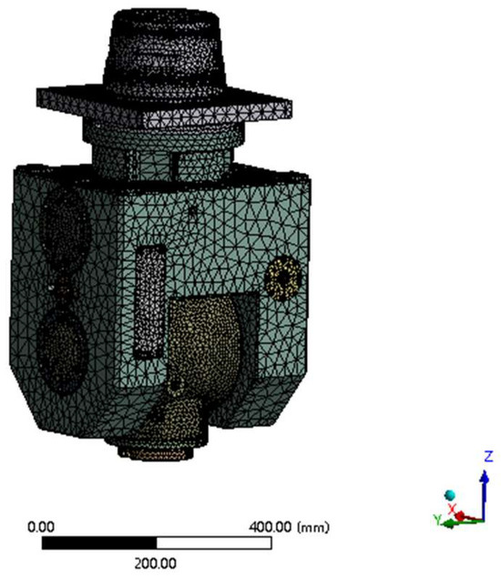 Due to the complexity of the internal structure of the A/C swing angle milling head, this paper simplifies the relatively minor process features in the digital model of the swing angle milling head, such as the chamfer, fine hole, undercut, oil channel, etc., in order to reduce the calculation time of the finite-element analysis. Then, the simplified swing angle milling head model is imported into ANSYS Workbench (2021 R1, ANSYS company, Pittsburgh, PA, USA) for mesh generation. In order to obtain ideal calculation results, the A/C swing angle milling head model is discretized by using the automatic mesh generation method, and the number of nodes and elements in the model is 976,796 and 572,014, respectively. The finite-element mesh generation model of the swing angle milling head is shown in Figure 3.