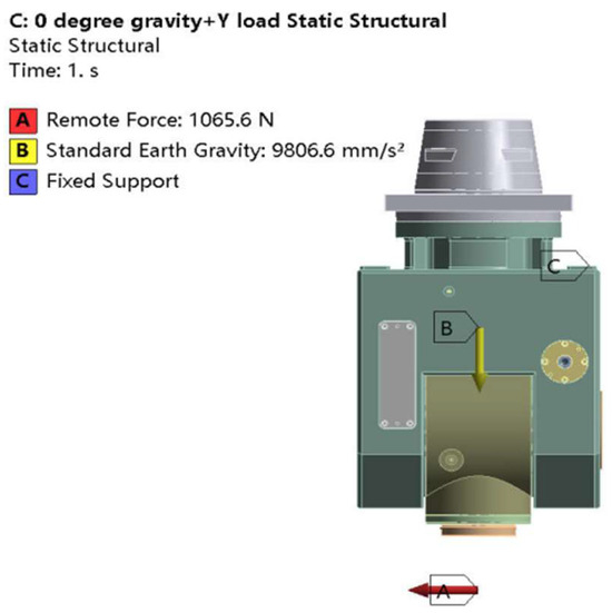Before conducting static analysis, it is necessary to add loads and constraints. A fixed constraint is applied to the upper-end face of the swing angle milling head, and then the load step method in ANSYS is used to add a standard gravitational load to the connection surface between the swing angle milling head and the slider. The milling force is applied in the form of a remote force in the model, with the point of action set at a distance of 100 mm from the tip of the swing angle milling head [25]. The deformation caused by the longitudinal feed force Fh and vertical feed force Fv is relatively small and has little influence on the machining accuracy of the milling head, and thus can be ignored. Therefore, in this paper, the effect of the cross-feed force Fe on milling head deformation is selected. An infeed force Fe is added to the model in the form of a remote force. Figure 4 shows the constraints and loadings of the milling head under gravitational and milling forces in the Y direction when the milling head’s A-axis is at 0°. Note that gravitational and milling forces need to be loaded separately when the load is applied.