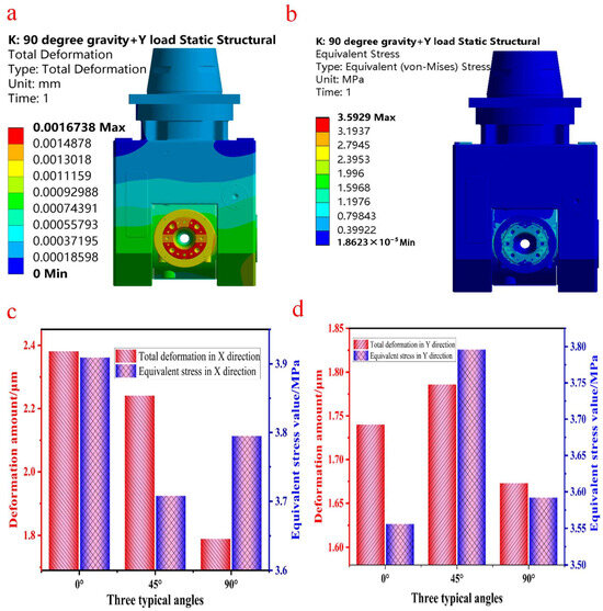 Results diagram of different angles of the swing angle milling head under the action of gravity and milling force in the (X, Y) direction. (a) Deformation cloud map at an angle of 90° under gravity and Y load. (b) Stress cloud map at an angle of 90° under gravity and Y load. (c) Stress and deformation values at different angles under gravity and X load. (d) Stress and deformation values at different angles under gravity and Y load.
