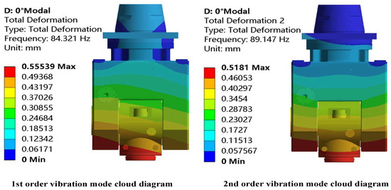 ANSYS Workbench was used to conduct modal analysis on the double swing angle milling head of the machine tool. The dynamic performance of the swing angle milling head is basically determined by the low-order natural frequency [26], so only the first two modes of the swing angle milling head under typical working conditions are extracted in this study. The modal analysis results at an angle of 0° are shown in Figure 6 and Table 3.