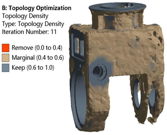 The constraints and loads imposed by the universal joint are shown in Figure 9. Constraints are added at the upper end of the universal joint, and the two toroidal surfaces in the middle of the upper end are subjected to a positive pressure of 700 N and 1000 N, respectively. A total of 9850 N of vertical downward pressure is applied to the four semicircular surfaces at the lower end. The material removal rate was set at 20% as the optimization objective for calculation, and after 11 iterations, the density cloud map of the optimized universal joint was obtained, as shown in Figure 10.