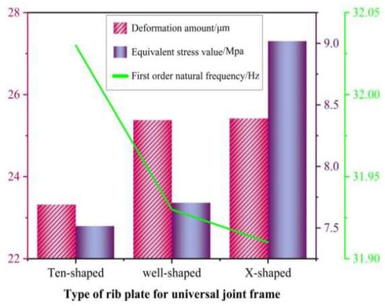 The static and modal analysis results of the three types of rib plate configurations of the universal joint were obtained through finite-element analysis, as shown in Figure 12. From Figure 12, it can be seen that the minimum deformation and equivalent stress among the three rib plate configurations of the universal joint is the “ten”-shaped rib plate. Compared with the other two rib plate structures, the “ten”-shaped rib plate configuration has the best static stiffness in the universal joint. Moreover, compared to the other two rib plate configurations, the ten-shaped rib plate configuration of the universal joint has the highest first-order natural frequency and the best dynamic stiffness. Analysis shows that the ten-shaped rib plate configuration of the universal joint has a better static and dynamic performance than the other two rib plate configurations. Therefore, this article uses the ten-shaped rib plate structure to replace the materials on both sides of the original universal joint.