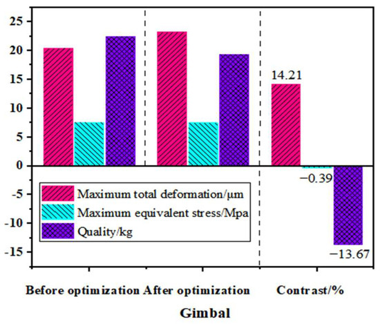 - Through the analysis of the results of the gimbal before and after optimization, it is shown that, under the premise that the stiffness and strength meet the design requirements, the weight reduction ratio of the optimized gimbal structure is 13.67%, and the weight reduction effect is obvious.