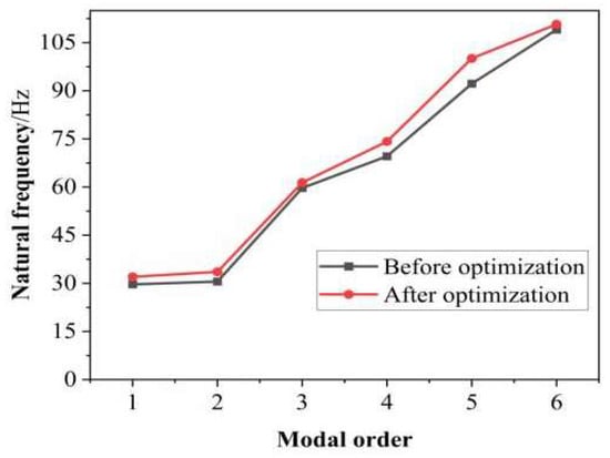 The same material properties and constraints as the original model were loaded for modal analysis, and the first six natural frequencies of the universal joint model with a “ten” rib plate configuration were recorded. The natural frequencies of the universal joint model before and after optimization are shown in Figure 14.