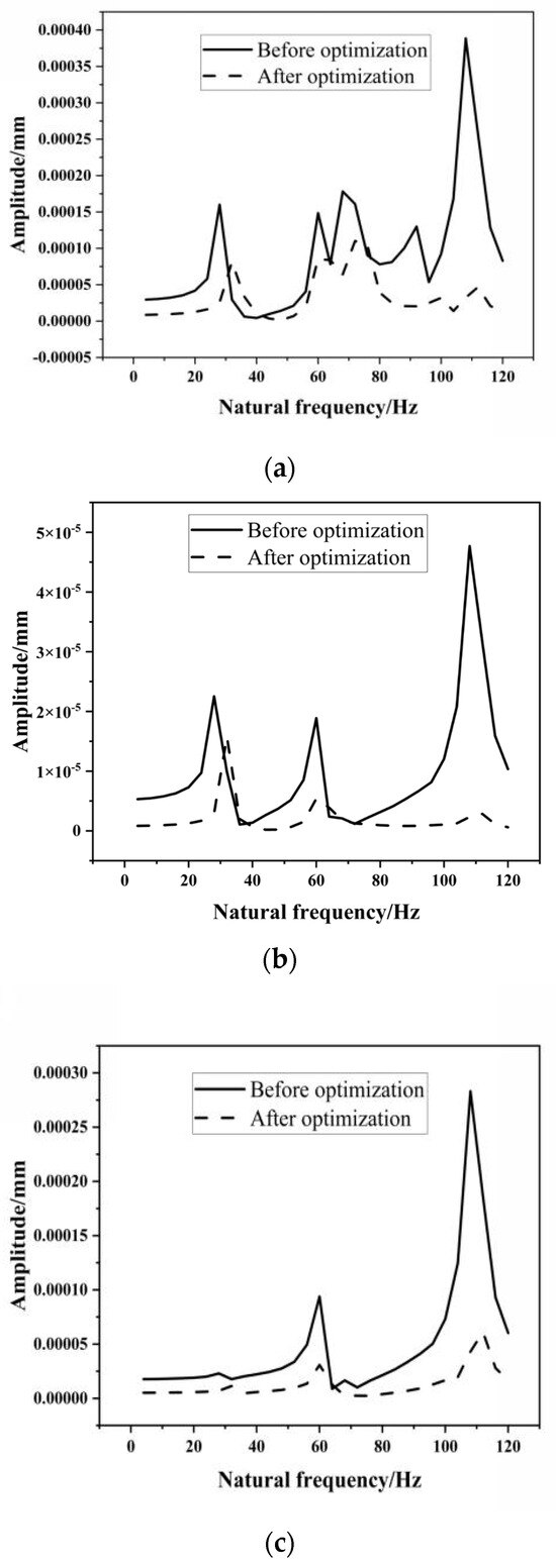Figure 15 shows the harmonic response analysis results of the universal joint in all directions before and after optimization. By comparing the response spectral lines before and after optimization, it can be seen that the frequencies at the peak points of the universal joint in the X, Y and Z directions are basically consistent with the first six modal results, which indirectly verifies the accuracy of the modal analysis. The peak values corresponding to the fundamental frequency in the X and Y directions are significantly reduced. The Y direction is relatively stable in the frequency range of 70–100 Hz, while the Z direction is relatively stable in the frequency range of 0–50 Hz. At the same time, a backward shift in the peak positions occurs to varying degrees in the three directions, which indicates a significant improvement in the dynamic performance of the universal joint and verifies the rationality of the optimization results of the universal joint.