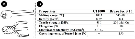 (A) A sketch of joint preparation for UW and soldering; (B) properties of copper C11000 wires [28] and BrazeTec S 15 solder [27].