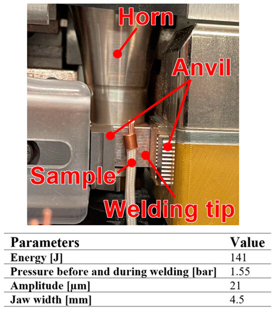 All welding parameters were continuously adjusted with a closed-loop control system that monitored the accurate settings of splice width, welding energy, welding force, and amplitude. Experimental welding parameters are shown in Figure 2.