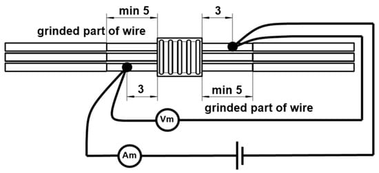Electrical resistance measurements were taken from 20 samples of each UW batch and 10 samples from each soldered batch using the Keysight 34420A (Böblingen, Germany) nano-volt/micro-ohm meter. A 4-wire resistance measurement method was utilized. Before testing, the wires were grounded at the gauge attachment point. Electrical joint resistance was assessed on the outer wires, with positions indicated in Figure 4. Connection clamps on the wires were spaced 10 mm apart. Each sample underwent three measurements.