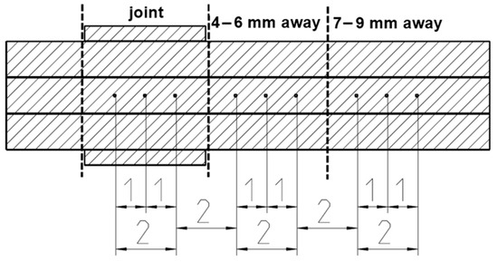 Microhardness was measured using the ZHU/zwickiLine+ (Ulm, Germany) universal hardness-testing machine, following the ISO 6507 standard [31] for Vickers hardness HV 0.2, with a 200 g weight. Analysis was facilitated by the Zwick testXpert V12.3 hardness edition testing software. Two each of the UW and soldered samples, both exposed and unexposed to thermal shock, underwent testing. Figure 5 illustrates the precise measurement point locations.