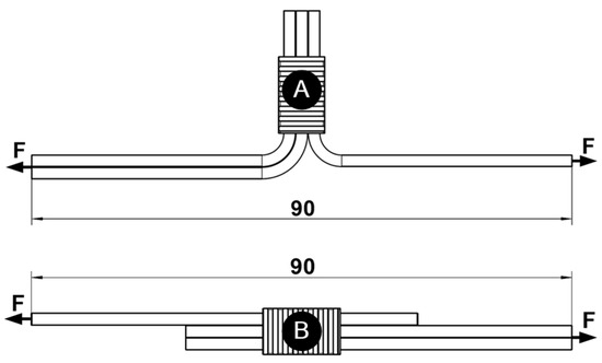 Tensile strength and peel-force tests were conducted in accordance with the MAN Truck & Bus AG WORKS Standard M 3455 [32]. The Zwick Z150 (Ulm, Germany) universal tensile-testing machine, equipped with the KAP-S 2 kN load cell, was utilized for both tests, and Zwick TestExpert II V 3.5 software facilitated the testing process. A pulling speed of 50 (+5) mm/min was maintained for both tests. Samples were held in grips specially designed for testing wires and cables, as illustrated in Figure 6. Peel-force testing was carried out on 26 UW samples and 20 soldered samples, as shown in Figure 6A. Tensile strength testing was executed on ten each of UW and soldered samples, as well as on wire, as depicted in Figure 6B. For each testing category, half of the samples had been exposed to thermal shock (TS), and the other half remained unexposed.