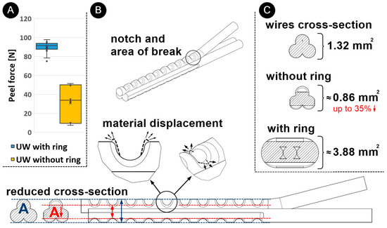 (A) Schematic representation of joint peel force after UW with and without a ring, (B) schematic representation of joint formation during UW without a ring causing material deformation and a reduction of joint cross-section (in red) and (C) wire cross-sections before welding and joint cross-sections after UW without and with copper ring.