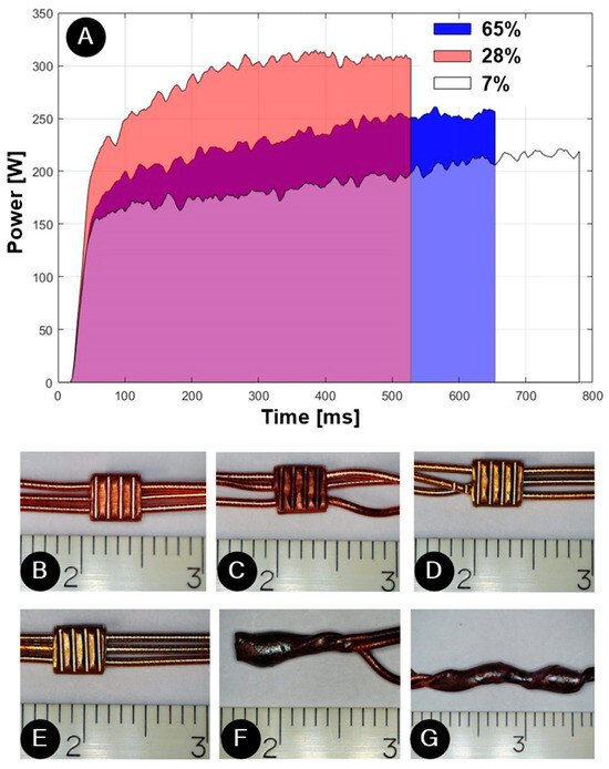 Based on the peel-force results in the preliminary tests, we selected welding with a ring for this study. Based on the preliminary parametric analysis, we selected welding with a constant energy of 141 J. The device recorded parameters based on time and power, producing a representation of the energy expended during welding. As evident from the weld-power graph in Figure 8A, welding characteristics varied across the samples due to the coefficient of friction. This coefficient is influenced by factors such as the positions of the wires in the weld joint, surface cleanliness, heat dissipation, and more. It was observed that 28% of the samples were welded at approximately 530 ms, with a peak power of around 300 W. These samples exhibited the highest friction coefficient. The majority of samples (65%) were welded within 650 ms, with a peak power of about 250 W. In contrast, a mere 7% of the samples were welded at about 780 ms, with a peak power nearing 220 W. These latter samples had some varnish residues on the wires, resulting in a lower coefficient of friction, lower power welding, and longer welding times when welding with constant energy. Similar conclusions for less-clean welds were also reported by Kuprvs et al. [33] in their study on copper wire welding.