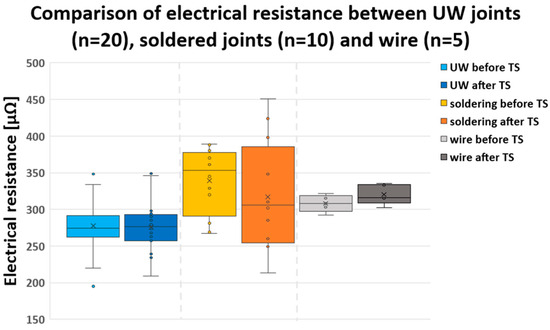 Figure 9 presents a box–whisker plot comparing the electrical resistance of UW joints, soldered joints, and the wire. For the UW samples that were unexposed to TS, the electrical resistance was 275 µΩ ± 33 µΩ, while it was 277 µΩ ± 33 µΩ for those exposed to TS. In comparison, the soldered samples that were unexposed to TS had an electrical resistance of 353 µΩ ± 44 µΩ, and it was 306 µΩ ± 70 µΩ for those exposed to TS. The inherent electrical resistance of the wires that were unexposed to TS stood at 308 µΩ ± 10 µΩ, and it was 316 µΩ ± 12 µΩ for those exposed to TS. The average values indicate that the results were closely aligned. Naturally, electrical resistances differ between distinct joining techniques and wires due to the substantial impact of the joint/wire cross-section on resistance. These results indicate that the variation in electrical resistance was 3 times less for the wire compared to UW joints and 5–7 times less than in soldered samples.