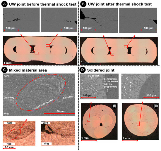 Analysis of microstructure of the UW joint (wire and ring) (A) before and (B) after the thermal shock test, (C) with ring–wire material mixing areas and (D) analysis of the microstructure with detailed views (SEM) of soldered sample (i) before and (ii) after the thermal shock test.
