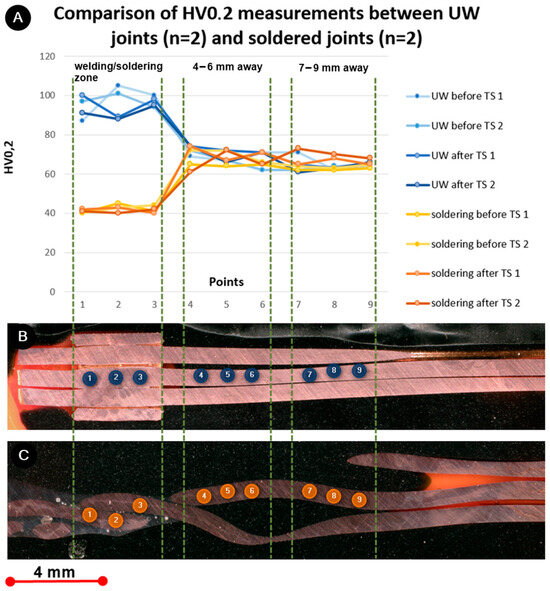 (A) Microhardness HV0.2 measurements of UW and soldered joints before and after thermal shock test. Positions of microhardness measurement points (1–9) for (B) UW joint and (C) soldered joint.